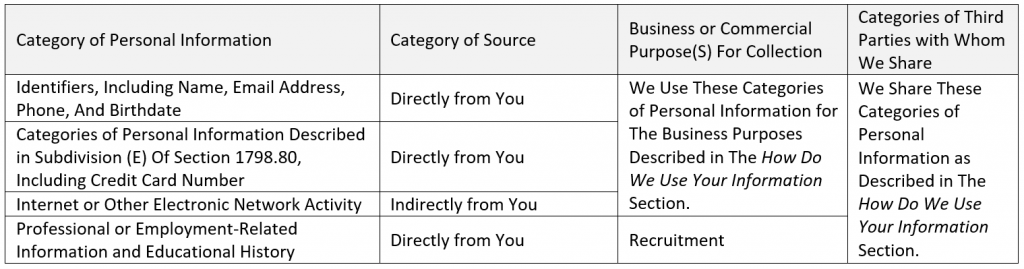 - The categories of sources for the personal information we collected about you.