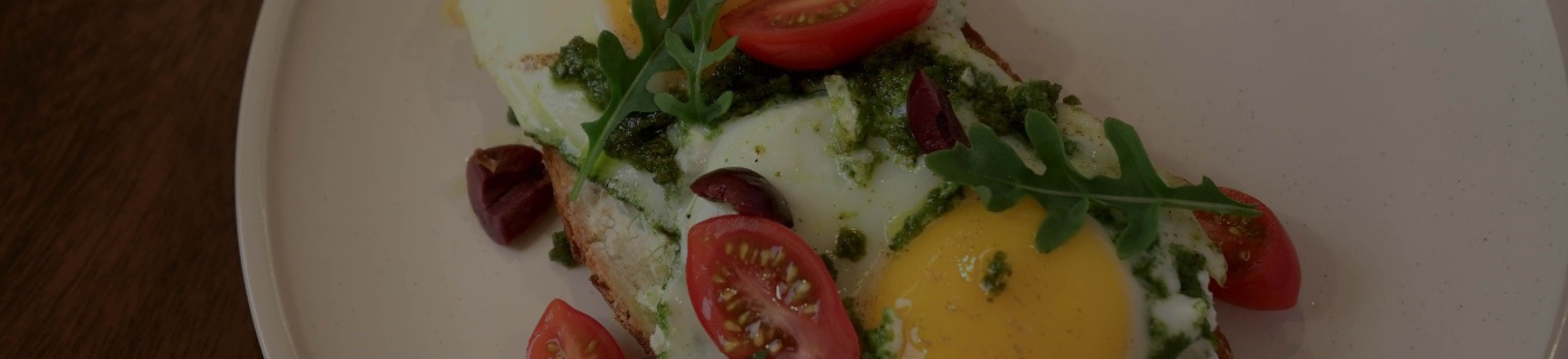 - Cuando los huevos estén cocidos, retíralos de la sartén y coloca 2 huevos encima de cada rebanada de pan. Vierta pesto adicional sobre los huevos según lo desee.